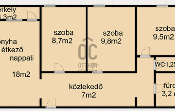 3 külön nyíló szoba, egy tágas konyha–étkező–nappali, fürdőszoba, külön WC, közlekedő és erkély biztosítja a kényelmes, jól szeparált életteret.